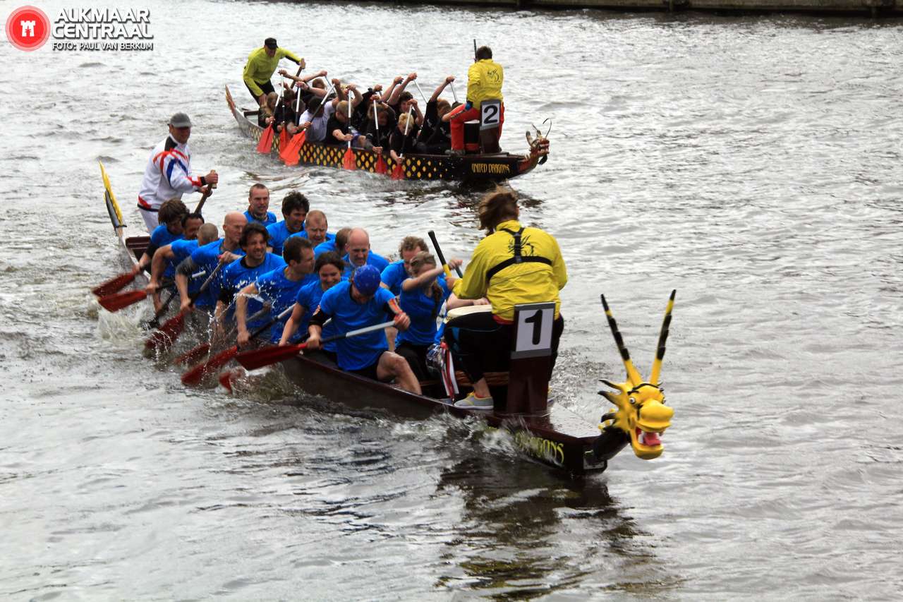 Alkmaar, 03 juni 2013. Zaterdag en zondag was het NoordHollands Kanaal voor de Noorder Arcade weer het strijdtonel van het altijd spectaculaire drakenbootracen. Wie legt de afstand tussen de Ringers- en de Friesebrug in een zo kort mogelijke tijd af en mag zich met zijn team Drakenboortkampioen noemen? Zaterdag zijn traditioneel de amateurs en de gelegenheidsteams aan de beurt. Eventuele tekortkomingen in techniek worden hier vaak ruimschoots gecompenseerd door fanatisme en doorzettingsvermogen. Drakenbootracen is een echte teamsport. Wanneer de roeiers niet precies gelijk en op de maat van de drum opereren halen individuele prestaties niets uit. Op zondag waren de gladgestreken technieken van de meer ervaren teams te aanschouwen. De snelheden lagen hier dan ook behoorlijk wat hoger. De Alkmaarse drakenbootvereniging 'United Dragons' geeft gelegenheidsteams ieder jaar de kans om eens aan deze spectaculaire sport te snuffelen. Clubfotograaf Paul van Berkum maakte deze mooie foto-impressie.