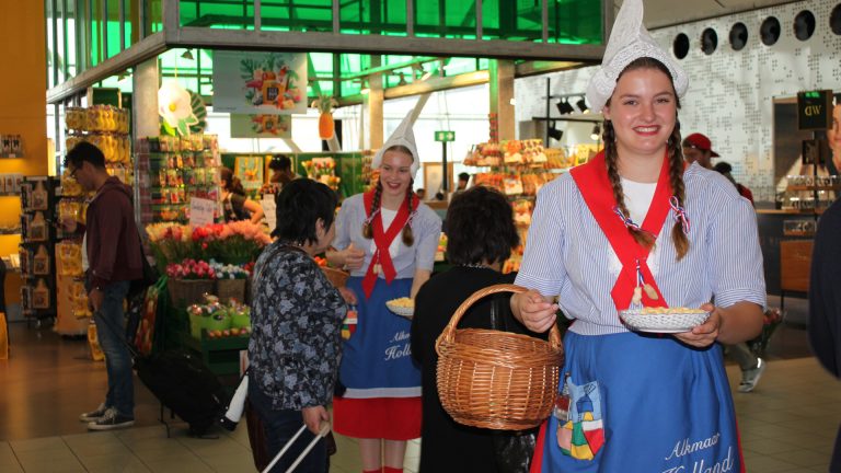 De kaas wordt uitgedeeld vanuit de Say Cheese-winkel achter de douane en vandaag (vrijdag) zijn de kaasmeisjes ook aanwezig bij de wachtrijen vóór de douane in Hal 2 en 3. Inkomende reizigers worden natuurlijk uitgenodigd voor een bezoekje aan Alkmaar.