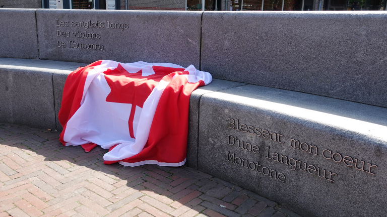 "Ik hoop maar dat ze hufterproof zijn." De programmacoördinator van Schoon Alkmaar komt woensdag een kijkje nemen bij de bankjes op het Alkmaarse Canadaplein. Het moet allemaal op en top netjes zijn als donderdag de wethouder wordt verwacht voor een plechtig moment waarbij twee beroemde dichtregels worden onthuld die het Canadaplein zullen sieren. Net als de naam 'het Canadaplein' verwijzen ook die dichtregels naar de Tweede Wereldoorlog.