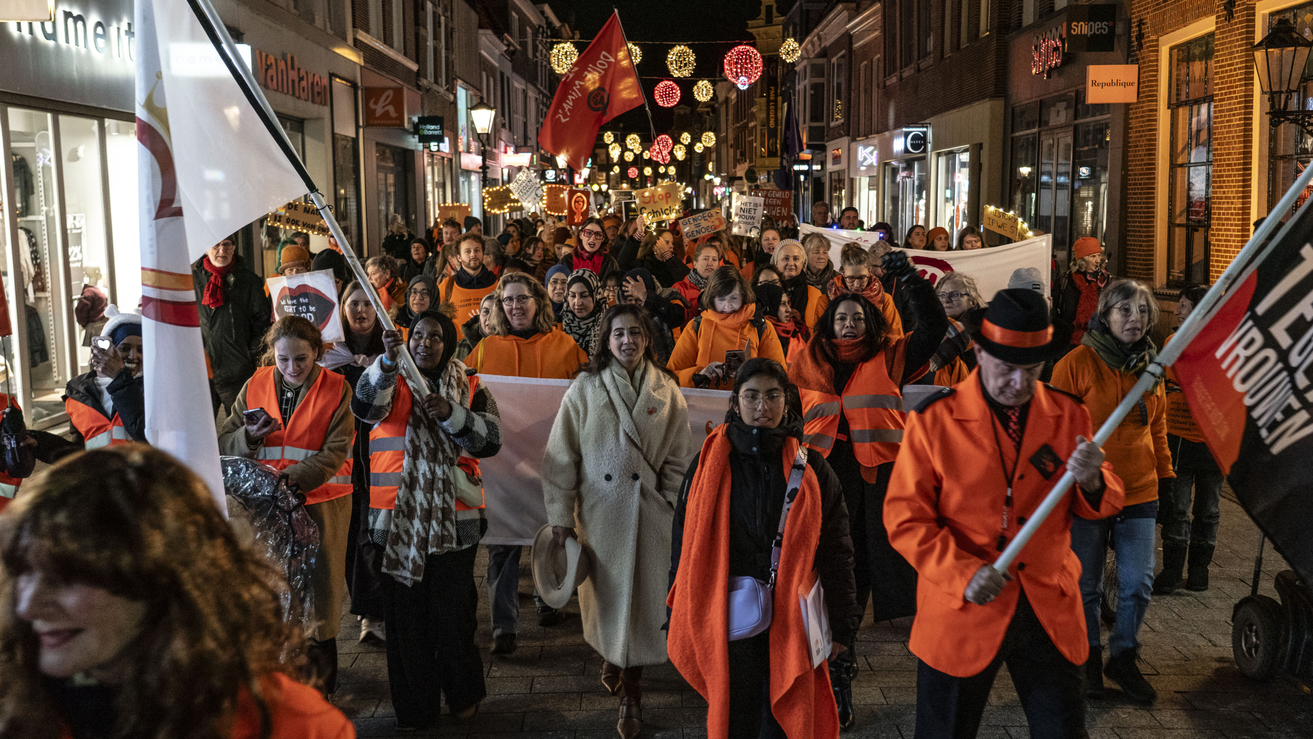 Via de Mient en de Langestraat trok de protestmars met in oranje gehulde demonstranten richting het Canadaplein. (foto: Marco Schilpp)Die heren worden rechtstreeks aangesproken door de wethouder. "Het is belangrijk dat mannen het voortouw nemen als het gaat om de rol die zij hebben te spelen in de samenleving. Want vrouwen kunnen het niet alleen, mannen hebben wel een hoofdrol te vervullen. Het is aan de mannen om de stilte te doorbreken, door een norm te stellen en elkaar aan te spreken als het gaat om ongewenst en vrouwonvriendelijk gedrag.”